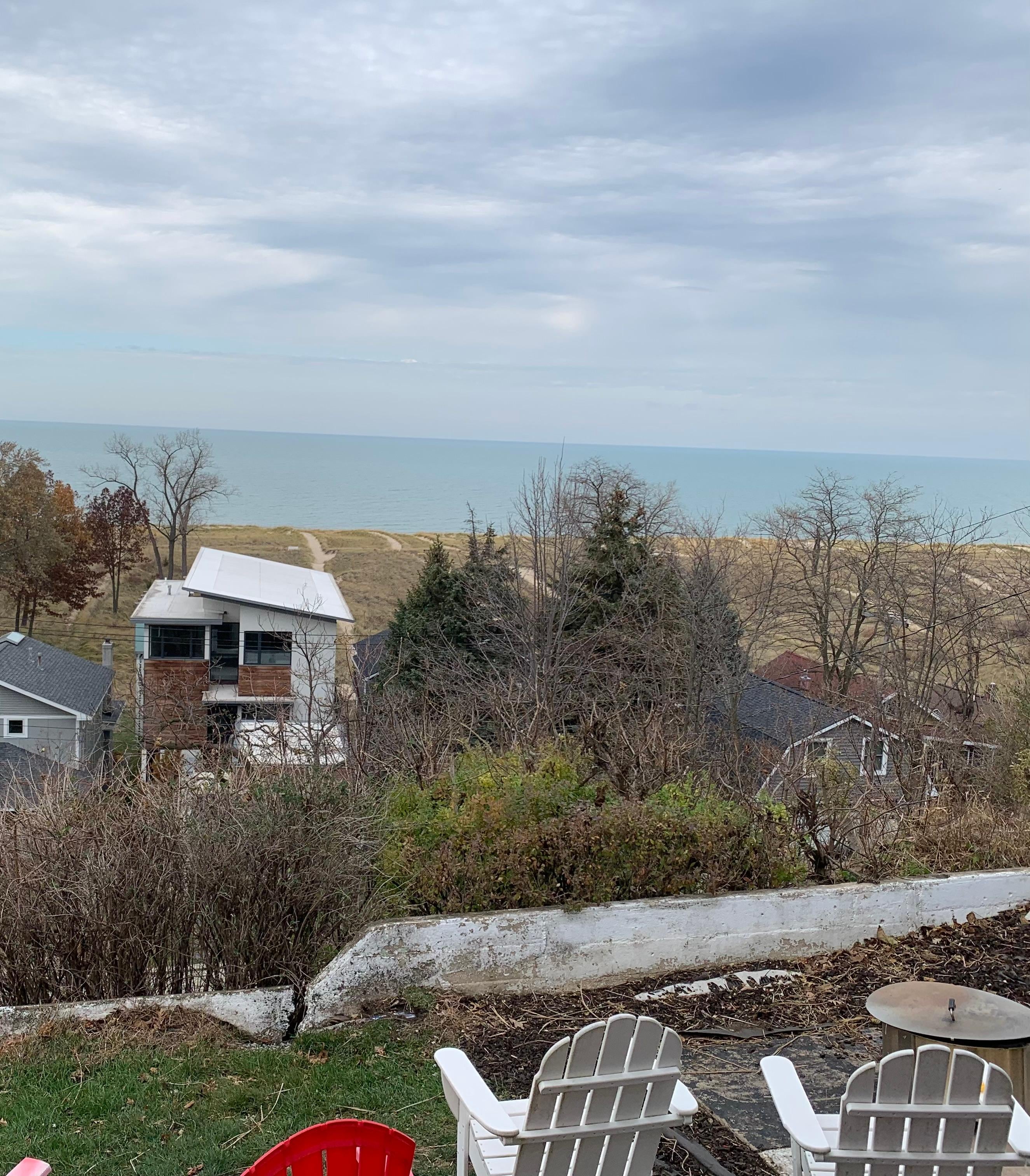 Located on Lake Shore drive directly across from the beach, and perched atop a sand dune offering amazing views of Lake Michigan, and even the Chicago skyline on clear days. Across the street from two beach stops, from outside you can get to the beach using either the front stair case or using the sloped driveway and street to the beach for a no stairs route. From the screened in covered front porch relax to the soothing sounds of the nature, waves and sights of boats gliding across the horizon. We frequently see lots of nature including bluejays, orioles, cardinals, hawks, deer and more. For over 120 years classic beach home has created long lasting memories for guests year after year.