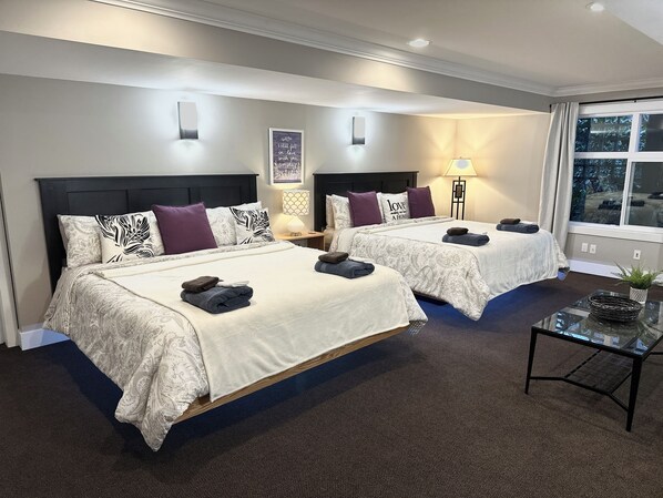 When you enter there’s a new kitchen with all appliances and attach family room area. The family room has a sofa bed that is queen sized. The suite has one very large bedroom with two floating king beds, a large second bedroom with a queen bed, a three piece washroom, and private laundry room.