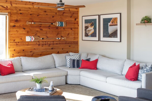 Living Room: Gather with loved ones in this spacious and inviting living area, featuring ample seating, a Smart TV, and an electric fireplace for cozy evenings in. Floor-to-ceiling windows provide sweeping views of the St. Croix River, bringing the beauty of the outdoors inside. With access to the balcony, you can seamlessly transition between indoor comfort and outdoor serenity.