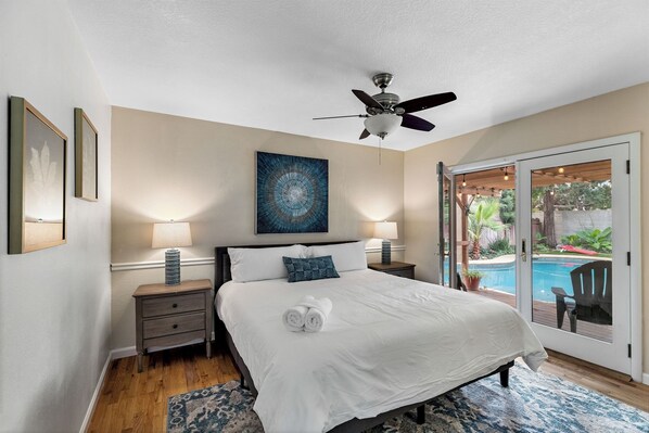 The primary bedroom features a luxurious king-sized bed and direct access to the outdoor space, allowing you to start your mornings in serenity. Additional bedrooms offer king beds as well, accommodating guests of all ages.