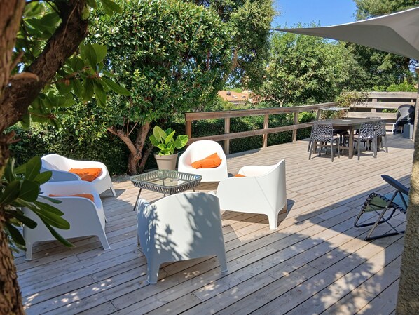 Jolie maison tres bien placée près de la plage. 2 terrases dont une couverte pour optimiser soleil selon heure de la journée et/ou pluie. Tres pratique avec des enfants en bas age car propriété fermée. Seul petit point negatif: 1 seul WC pour la maison.