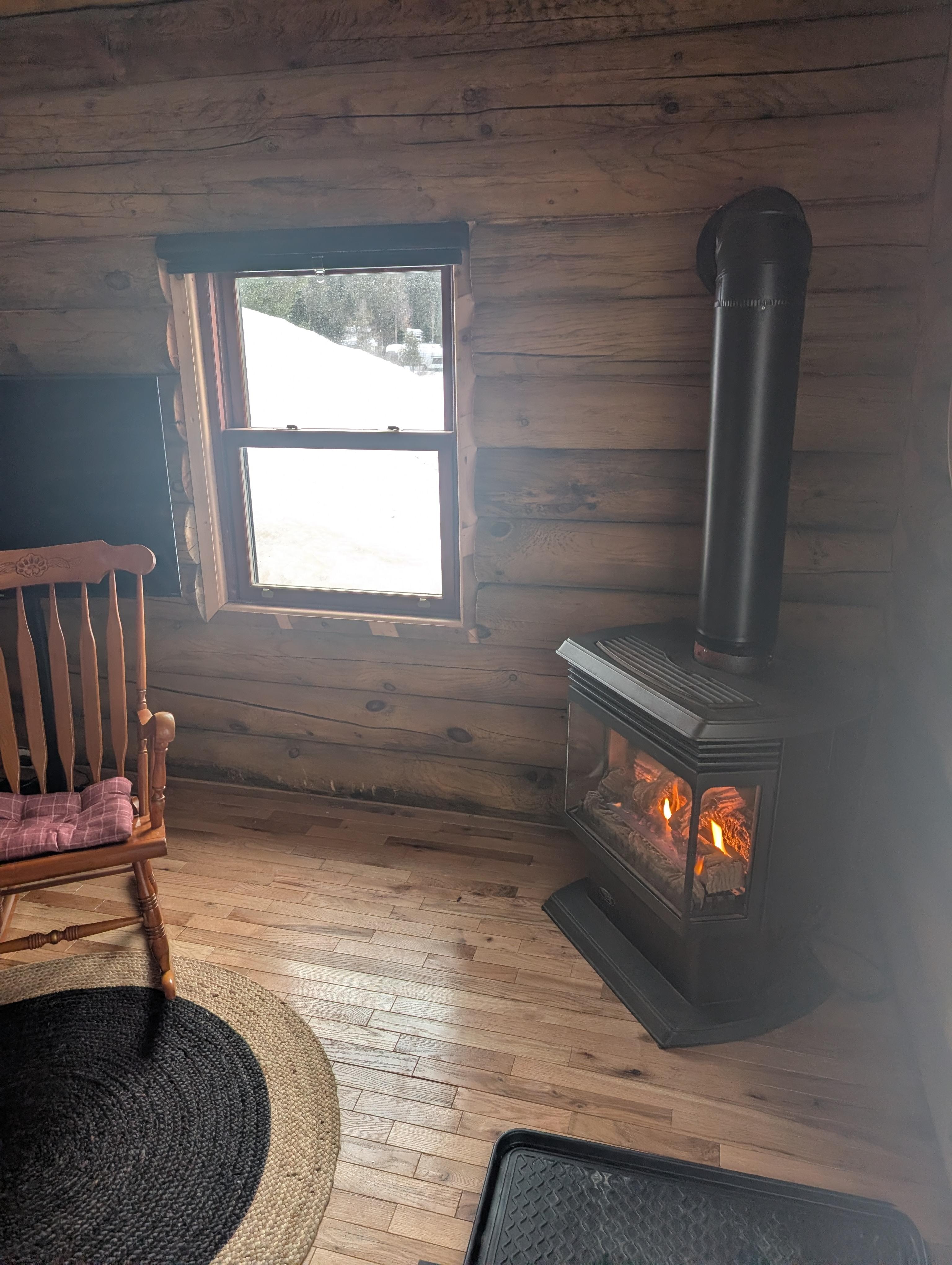 Experience our cozy log cabin with gas fireplace. Ideal for couples.