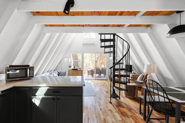 The well-appointed kitchen features everything needed for home-cooked meals, and the adjoining dining area makes the perfect spot for family gatherings or cozy dinners. The living room offers plenty of space to relax, with sliding doors that open the to the expansive deck. A bedroom and full bathroom are conveniently located on the main level. Follow the spiral staircase to the loft-style second bedroom. A desk is set up making it convenient for remote workers.