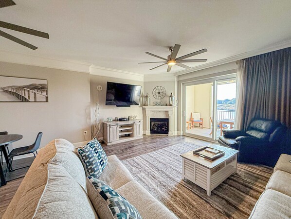 Inside, you’ll find a large open kitchen, comfortable living space, flat screen TVs, and a full-sized washer and dryer for added convenience. With king beds in both bedrooms and additional sleeping space in the living room, this condo is ideal for couples traveling together, golf groups, or families looking for a luxury waterfront retreat with extra outdoor space.