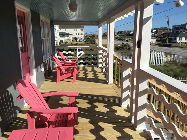 Huset har en fantastisk veranda med panoramaudsigt. Du kan endda fange glimt af havet mellem på tværs af gaden naboers hjem. Våbenhuset er fantastisk til afslapning og nyde din foretrukne drik, som du ser verden gå som folk spadsere, løbe og cykel langs multi-use sti, der er på tværs af gaden. Huset har også en awesome tilbage veranda med en bistro bord til morgenkaffe eller en intim middag.