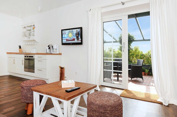 Størrelse: ca. 36 kvadratmeter Stue med integreret køkken Soveværelse Badeværelse med bruser, håndvask og toilet Stueetage optimalt til 1 til 2 personer og derudover et lille WLAN-barn, der kan bruges gratis! På forespørgsel kan du selv rengøre boligen ved ankomsten, så er der ikke noget rengøringsgebyr.
