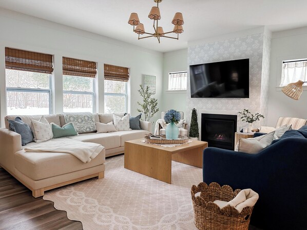 Living, Dining & Kitchen • Open-concept living and dining space designed for gathering, meals, and movie nights • Fully equipped kitchen for real cooking - not just reheating • Fully stocked coffee bar with drip coffee, Keurig, pods, teas, and morning essentials • Kid-Friendly Dining - hook-on-chairs, kid plates, and sippy cups provided so parents can pack lighter • Strong WiFi and a dedicated home office for remote work or school needs