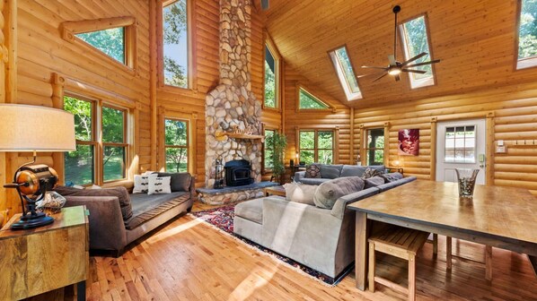 Alle senge er af h����j kvalitet. Tre af de fire dronning senge har pillow top madrasser, dobbeltsenge (1) ligger i det lavere niveau. Lavere niveau er en god plads for børnene at hænge ud med et tv, dvd-afspiller og et komplet badeværelse., Twin eller Enkeltsenge (2) En twin seng i hver af de ovenpå soveværelser., Sovesofa eller Futons (2) Rummelig dag seng sidder i store rum ved siden af brændeovn. Ekstra sovesofa i det nederste niveau. Lavere niveau har også et komplet badeværelse, tv, dvd-afspiller og en pellet pejs.