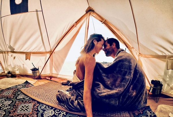 This lovely California tent retreat is perfect for outdoor enthusiasts. The California camping getaway is nestled near the bottom of the property and the rustic glamping rental sleeps up to four guests as it comes with two plush queen beds with 12-inch memory foam queen mattresses.