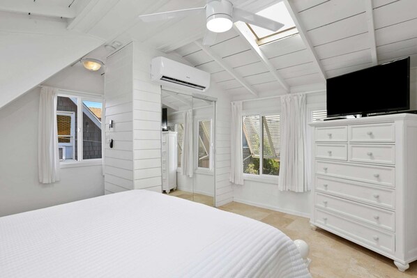 Det bageste sommerhus har et soveværelse ovenpå med en queensize-seng. Soveværelset er semi-privat; der er ingen dør på toppen af trappen. Rummet er åbent og lyst med et stort fladskærms-tv, masser af vinduer, flere himmellys oven på det hvælvede loft og en loftventilator.