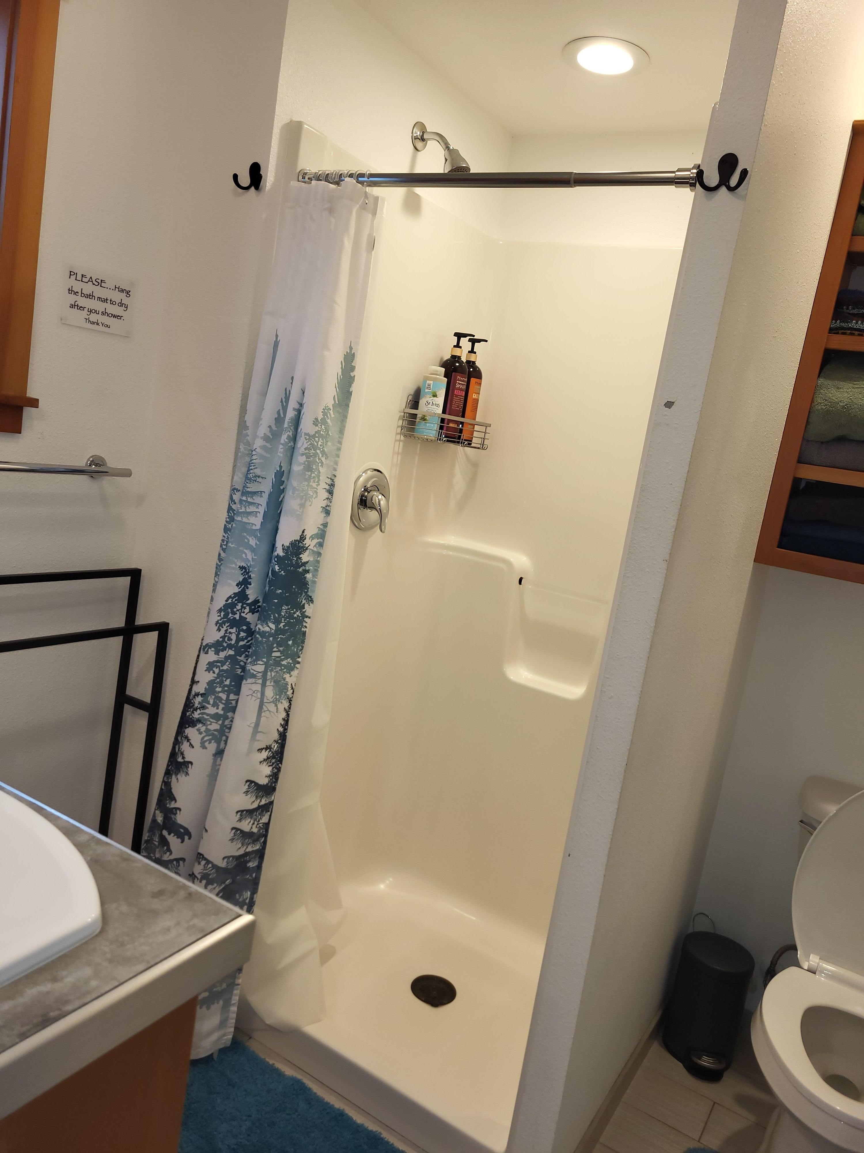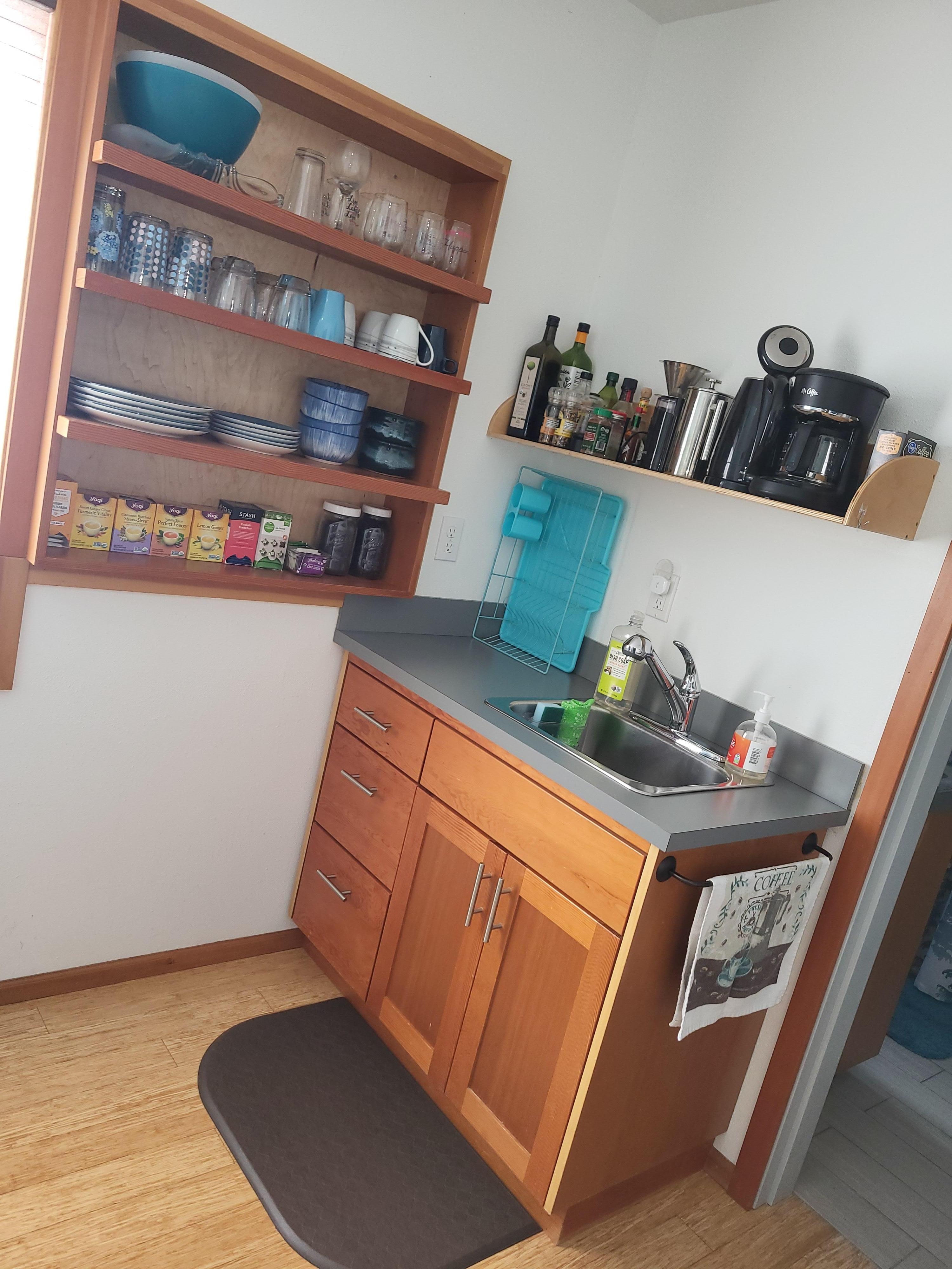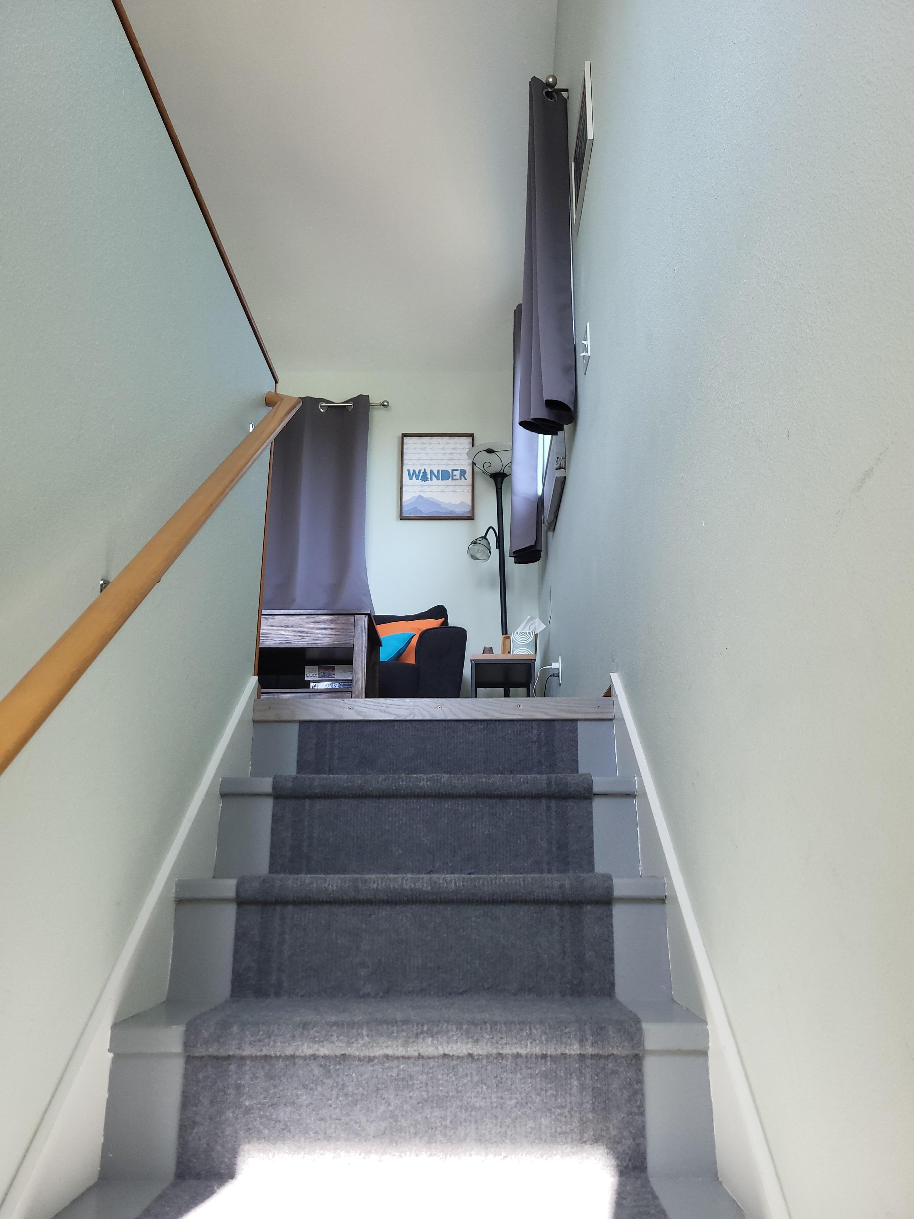 Directly across the entry door is your apartment. You enter into the fully stocked kitchenette with the bathroom off to the side. To your left are the stairs that lead to the living space with cathedral ceilings, windows on all 4 sides, queen size bed, loveseat, coffee table, reading light, Smart Tv with Roku and a fully articulating arm, closet with hangers and built in shelves, extra pillows, blankets, and comforter, weighted blanket, full length mirror, TV tables, tower fan, iron/board, and vacuum.