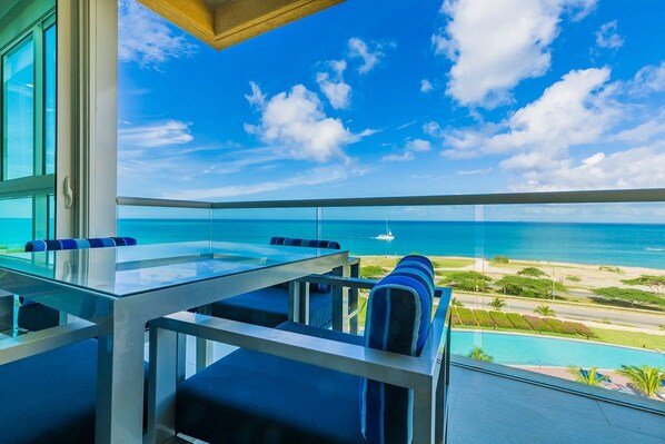 This air-conditioned two-bedroom suite has a spectacular ocean view. Featuring one King bed and two full beds, two full bathrooms with hairdryer, a fully equipped kitchen, a dining and living area with sofa bed which unfolds to a full-size bed, and washer and dryer. One step onto the balcony through sliding doors as you gaze out at the ocean. The Master bedroom has a beautiful ocean view as well as the living room area. Free Wi-Fi and TV’s in all rooms.