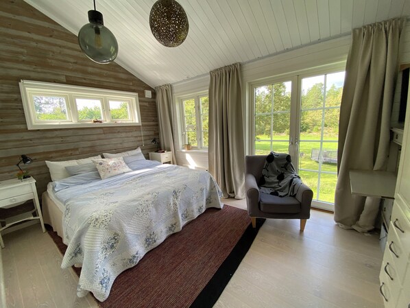 I det store hus, som er blevet renoveret, finder du 4 soveværelser, stue og køkken i en åben stue, badeværelse med brusebad og toilet. Vi har også et hems med trapper, og her finder du en king size seng, men det er ikke fuldt stående hovedrum.