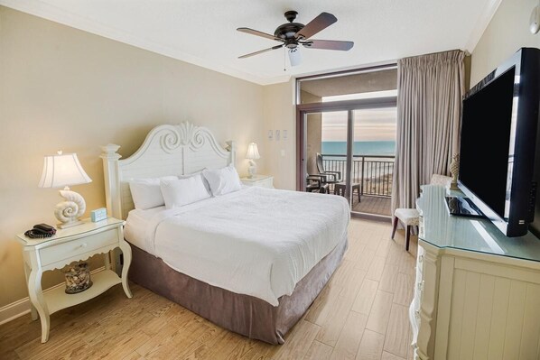 This oceanfront three-bedroom, three-bath condo comes with a spacious, fully equipped kitchen, a washer and dryer, glass-enclosed showers, a whirlpool tub in the master bathroom, a large private balcony, four flat-screen TVs, and wireless Internet access. The sleeping arrangements include one king in the master bedroom, one queen in the second bedroom, and two queens in the third bedroom.