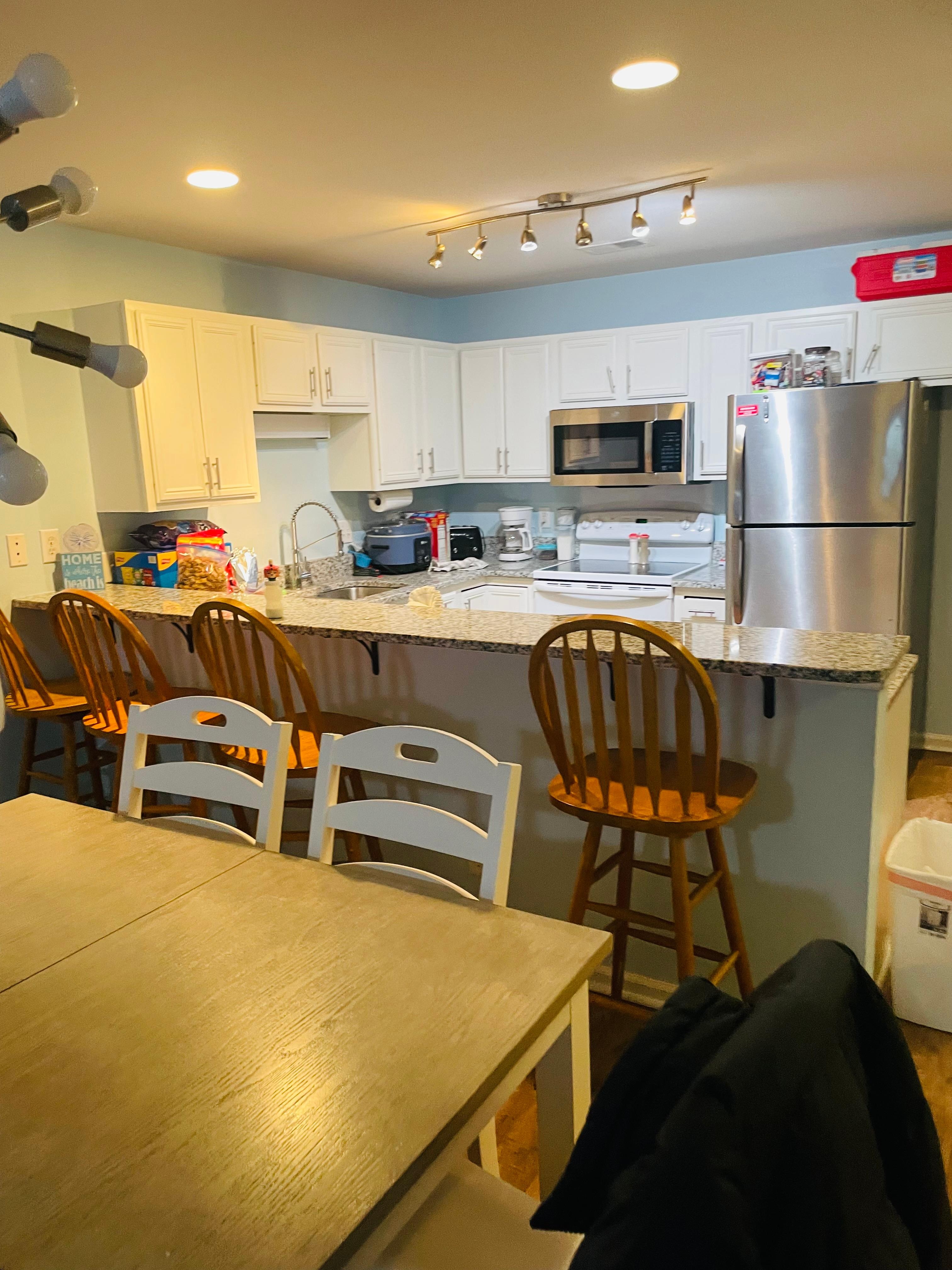NEW Granite counters, full-size fridge, stove, microwave, toaster, blender, drip coffee maker & cookware