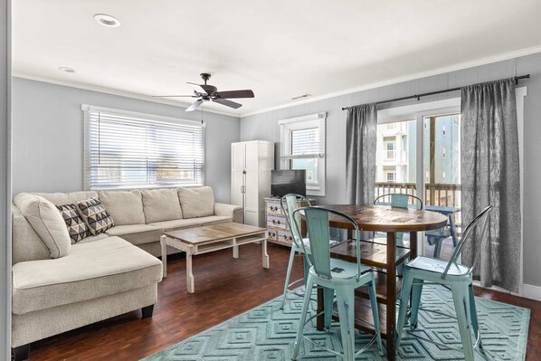 Coastal simplicity just steps from the beach. Located in midtown, this 2nd floor unit is ideal for families and groups seeking a convenient coastal stay. Each unit includes 3 bedrooms and 2 bathrooms, sleeping up to 6 guests, and features a fully equipped kitchen with a gas stove and dishwasher, plus private parking.