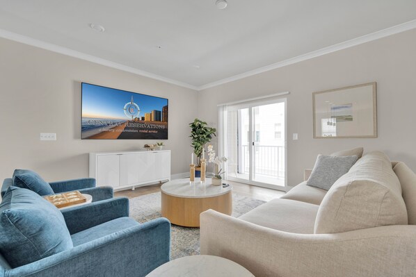 Head upstairs to the third level, where the luxurious master bedroom boasts a plush king bed, spa-like, ensuite bath with a sleek glass-door shower, a spacious walk-in closet, and a private, breezy balcony. Bedroom two offers a comfortable queen bed and ample walk-in closet, as well as an adjoining, modern full bath with a tub/shower combo.