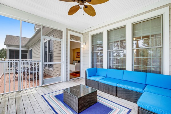 The full kitchen includes a French-door refrigerator and ample counter space to help you prepare a delicious meal and you can serve up to six guests at the dining table. Afterward, let the dishwasher knock out all the dirty dishes while you adjourn to the deck or screened-in porch to share a few glasses of wine with your guests. Take a short walk to check out the many nearby shared amenities that include a pool, a children's pool, a sauna, and basketball and tennis courts. The kids will love playing with the provided board games, and the home's high-speed WiFi makes it quick and easy for online students to complete their projects on time. The private washer/dryer will keep everyone's clothes nice and clean and the central AC is the perfect way to keep cool during your warm-weather stays.