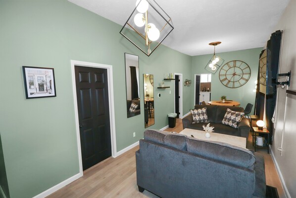 When you enter the space, you are immediately met with an inviting, open floor plan and modern, bright finishes. With a comfortable sofa and an HDTV, you will be able to easily unwind, kick back, and relax after a full day of travel.