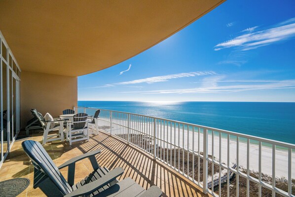 Step inside and experience spectacular Gulf views from the balcony or through floor-to-ceiling windows in the living room and master bedroom. Additional windows on the west side of the living room, as well as in the 2nd and 3rd bedrooms, provide unobstructed views of stunning Gulf Coast sunsets.