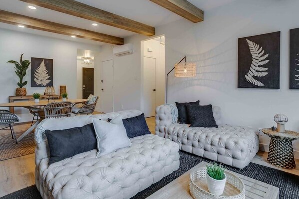 The unit includes a large open area that includes the living room, dining room and kitchen. Notice the large windows, wood floors, beamed ceilings, fireplace in the living room and the space!!