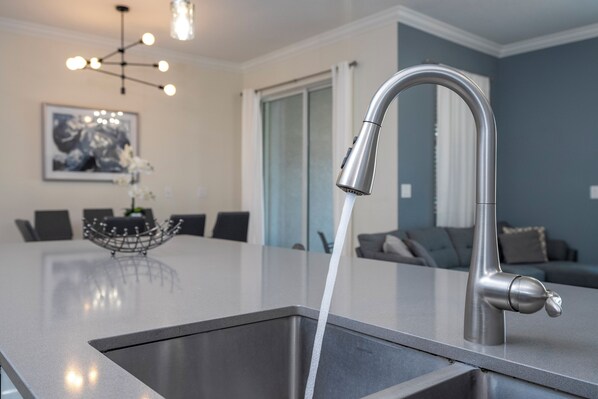 * Fully equipped kitchen with stainless steel appliances and essential cookware