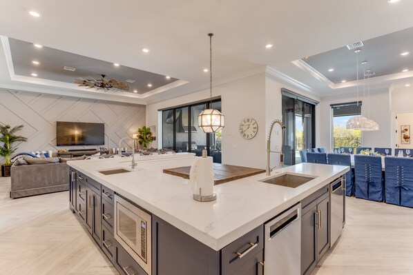 The kitchen features plenty of counter space throughout on the custom quartz countertops, with plenty of space to prep the holiday dinner. Guests will enjoy the luxury appliances, including an Electrolux fridge and freezer, a Wolf convection oven, a gas range stove with six burners and griddle, and double stoves. The gas range stove even features a pot filler to save the hassle of lugging pots of water from the sink. After dinner, having two full-size sinks and double dishwashers will make cleaning up even easier. Wine connoisseurs will appreciate the built-in wine fridge, and early risers will get a fresh cup out of the Nespresso coffee maker. The kitchen also features a large dining nook, with plenty of bench seating and space to eat or enjoy a game! Bar seating for five is perfect for enjoying breakfast, or watching tv while having a bite! The dining room has a great view of the resort-style patio and boasts a grand dining table with seating for eighteen.