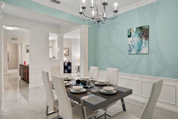 With stunning granite countertops, stainless steel appliances, and plenty of counter space, this kitchen includes everything you need during your stay away from your home. Enjoy your morning coffee or late night dinner with your family. Gather in the stylish dining room to enjoy meals together.