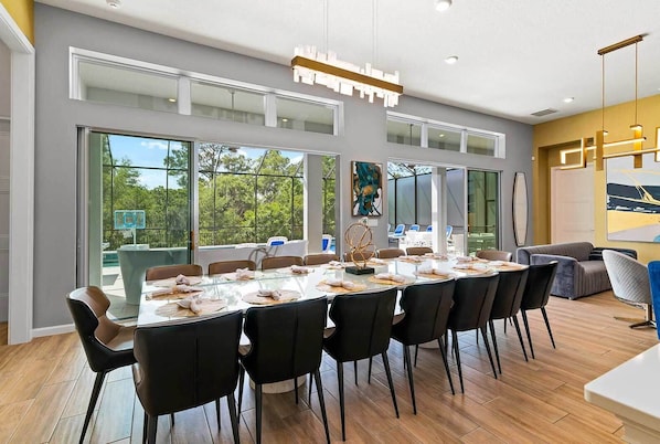 KITCHEN/DINING ROOM: The adjacent top-of-the-line kitchen boasts premium appliances, warm copper fixtures, and sleek blue and cream cabinetry—fully stocked with everything you need to prep and serve up delicious meals (or pop open those takeout containers...yeah, we get you!). Grab a bite at the kitchen island with barstools, or make it a full-on feast around the oversized dining room table.