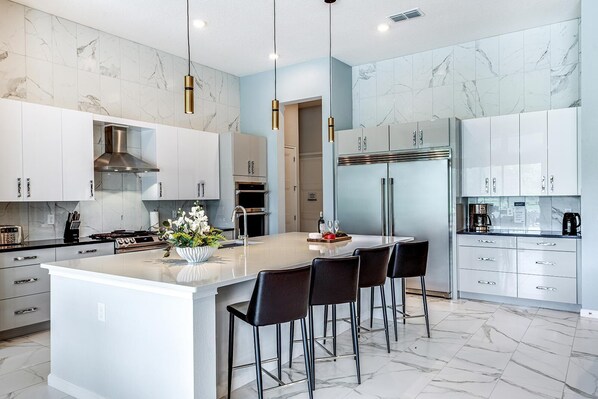 KITCHEN/DINING: Within this mansion’s open-plan living space, the modern kitchen stands out with gleaming white cabinetry and marble countertops, top-of-the-line appliances, and all the cooking gadgets you need to feed upwards of 28 guests. Tucked behind the kitchen, an oversized dining area easily doubles as a conference room, in case a meeting or event is on the agenda.