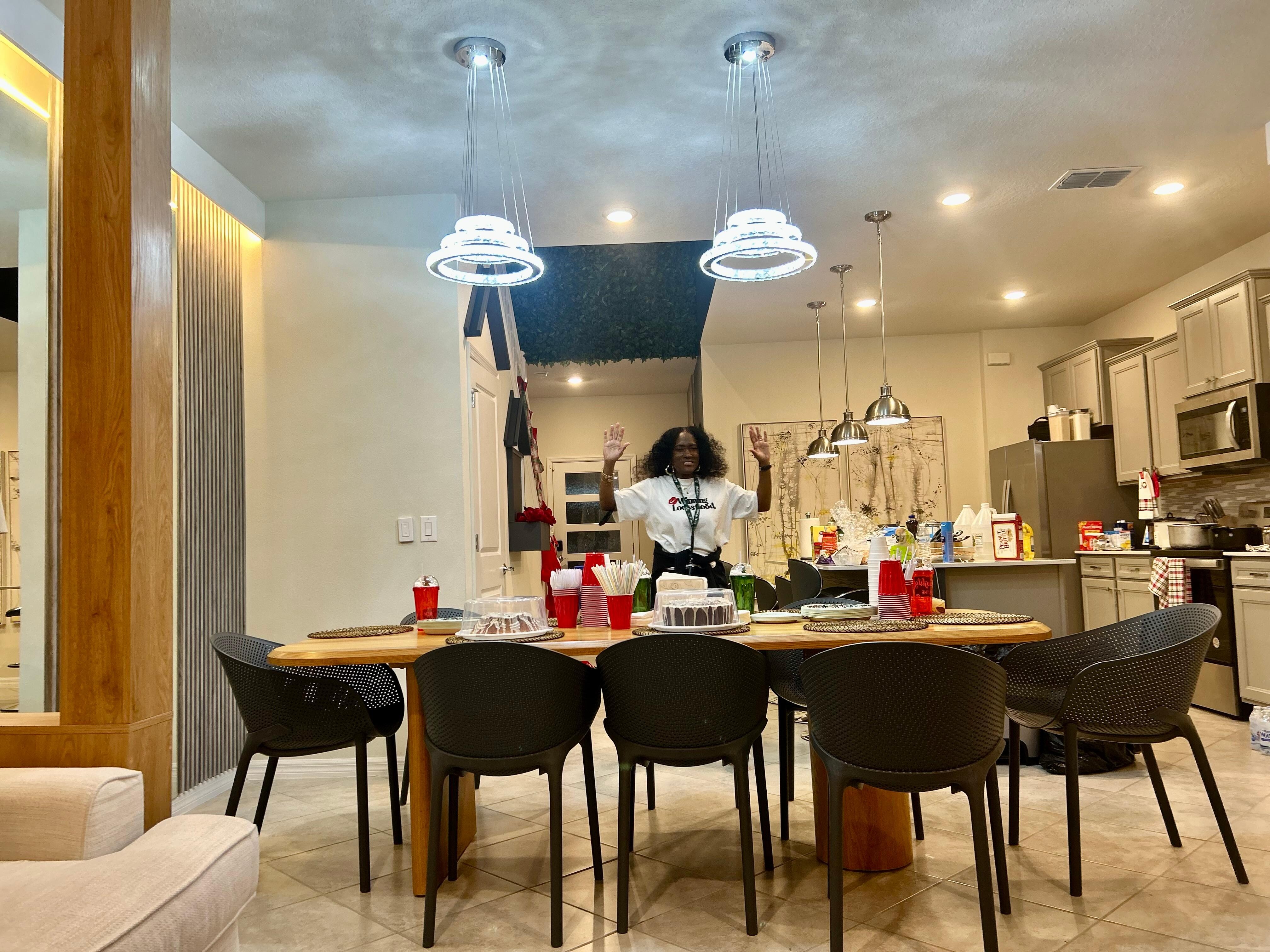 The fully equipped kitchen includes modern appliances, granite countertops, and a breakfast bar for 4, while the formal dining table seats 8, offering plenty of room for shared meals. A cozy breakfast nook with seating for 5 provides a more casual dining option. Each bedroom is thoughtfully designed, with spacious King and Queen suites offering private or shared bathrooms, while kids will love the Minion-themed bunk room, adding a playful touch to their stay.