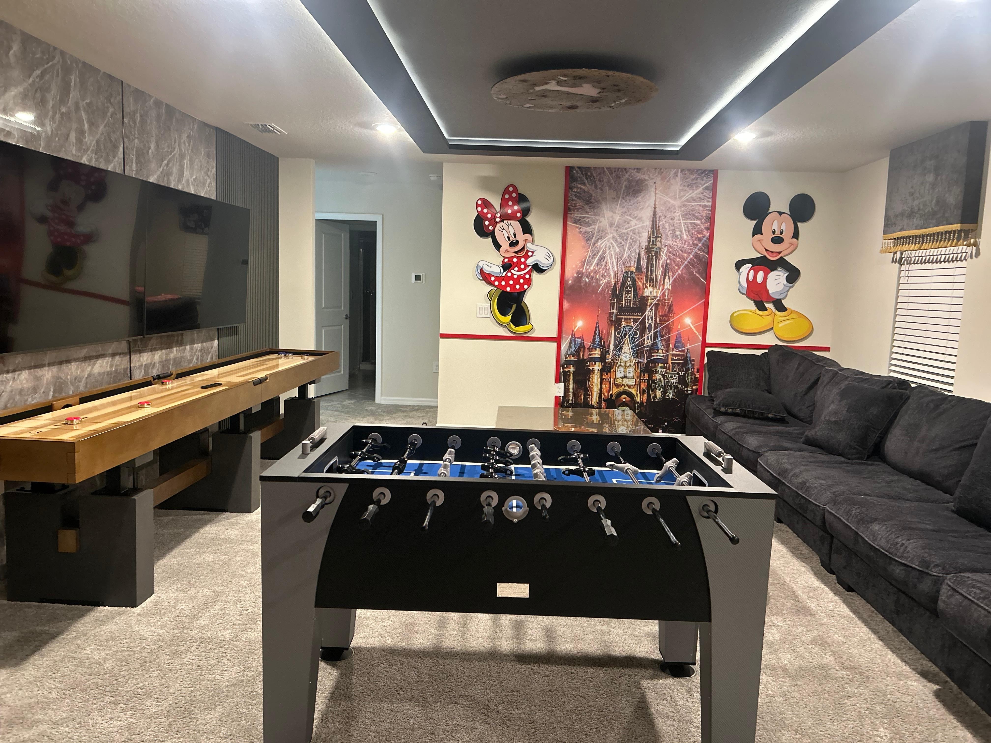 Entertainment abounds at Emerald Villa with a custom games room featuring arcade-style fun for all ages and a relaxing screened-in pool area complete with sun loungers. Whether you’re enjoying poolside relaxation, family dinners, or a quiet night in, this villa is your private oasis near Orlando’s top attractions.