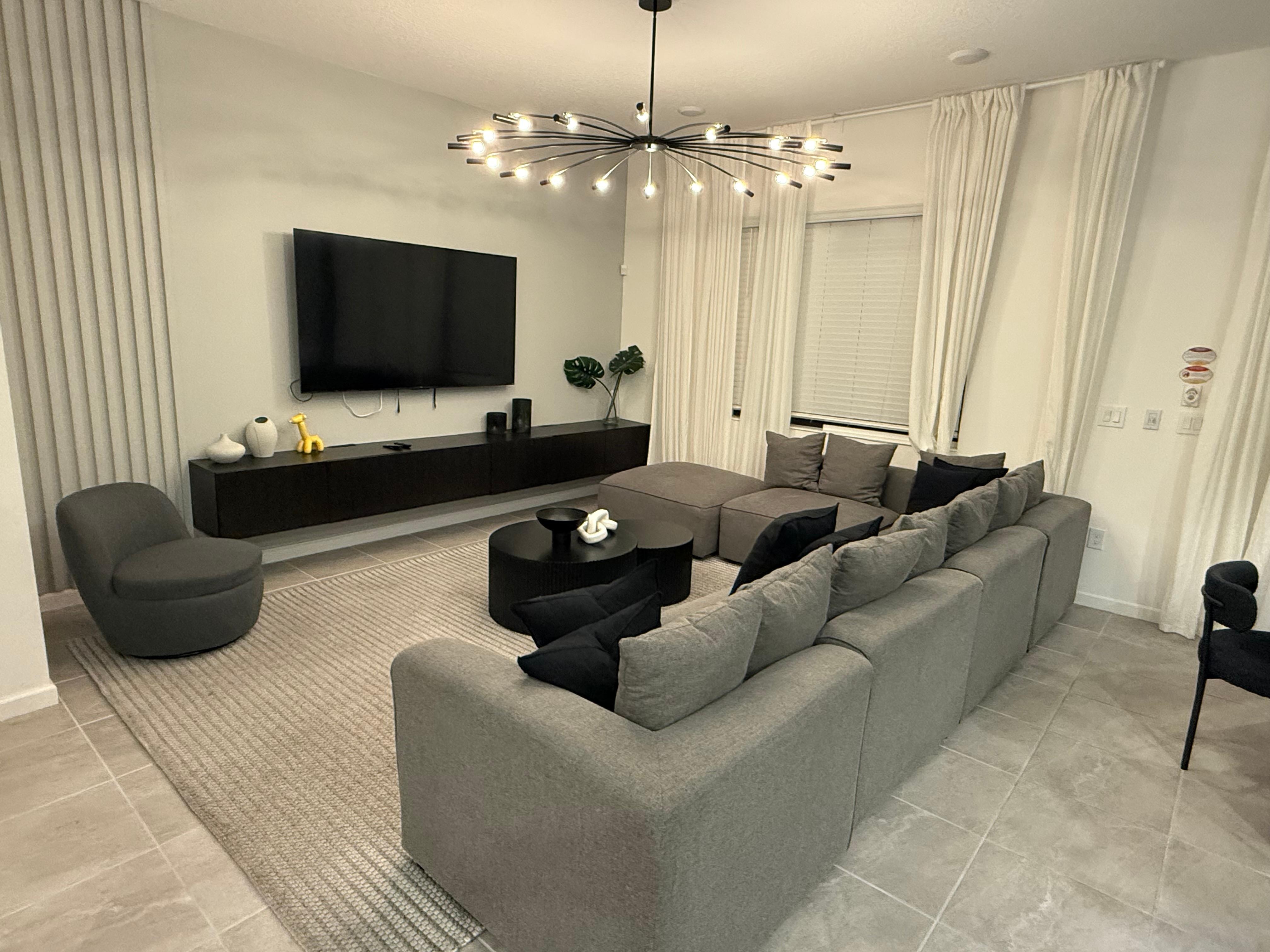 Our entire family absolutely loved the house. Everything from the beauty of the decor to the cleanliness of the house was perfect. We spent a lot of time in the pool as well, and our family of 12 enjoyed every minute!We were pleasantly surprised that there are two refrigerators and two dishwashers in the kitchen, along with the stove and microwave. The outdoor kitchen was wonderful. We grilled beef tenderloin one night and spare ribs on another night. The house is literally 10 minutes from Sea World and 25 from Disney World, so convenient for our outings. Plus, there is a really nice large swimming pool just steps away from the house with a lazy river and fun sprinklers for the young children. We loved the two living areas in the house, one down and one up. The kids really liked being together in the upstairs one. The management company, Innovare, was awesome at answering any questions very quickly. They could not have been better at communicating with us. All in all, we highly recommend this house for future vacations!