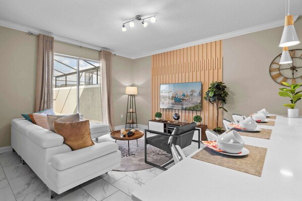 Unwind in this stylish 4-bedroom retreat, perfect for up to 10 guests. The open living space flows into a fully-equipped kitchen and dining area, creating a welcoming atmosphere. Enjoy a private pool and themed Mickey & Avengers bedrooms for a fun touch. Located in Storey Lake, just 10 minutes from Disney, with access to pools, a lazy river, a fitness center, mini-golf, and more. A memorable getaway awaits!