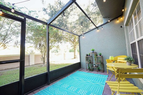 Private Patio – Relax outdoors with a charming flower wall for privacy