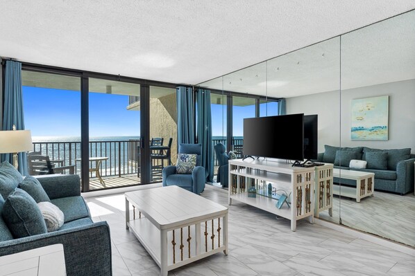 Pelican Walk 804 is a spacious 835 square foot condo that features a NEW Queen sleeper sofa and NEW living area furniture & decor, added in late Spring 2024! The remodeled kitchen is fully equipped and opens to a combination dining & living area that walks out to the Gulf front balcony. The view is beautiful! The dining area seats 4 at the dining table, along with stools for breakfast bar. This vacation rental has a Queen bed in the bedroom with an adjoining private bath that has a tub & shower combo. There is also a second full bathroom in the hall with a shower and there is a stackable washer & dryer in the condo.
