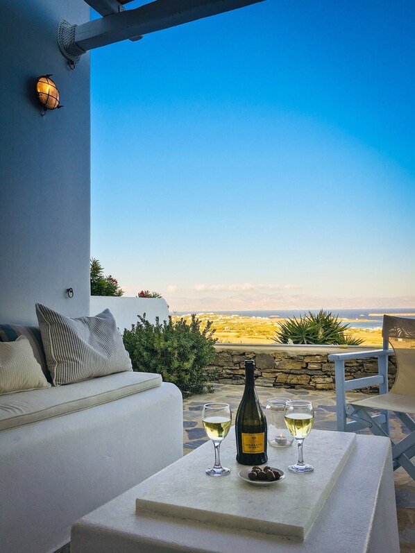 Huset ligger på øen Paros, på skråningen af en bakke med en sydøstlig retning. En brolagt vej fører fra hovedvejen til villaen. Solen skinner direkte på huset fra solopgang til tidlig aften. Fra alle værelser og fra den rummelige terrasse kan du nyde en panoramaudsigt over Det Ægæiske Hav. På dage med klar luft kan der ses op til syv Ægæiske øer i horisonten. Huset kombinerer Kykladas traditionelle arkitektoniske stil med moderne udstyr og æstetiske arkitektoniske detaljer: 50 cm tykke vægge, rumhøjde over 3 m, valnødlofter fra Mount Athos og andre. a. En privat swimmingpool (ca. 5x7m i størrelse - udelukkende for gæsterne i dette hus) og en have med oliventræer og andre indfødte planter inviterer husets gæster til at slappe af. Placeringen omkring huset er helt stille - bortset fra naturen er der intet at høre. Huset har gratis 4G internetadgang og gratis WiFi.