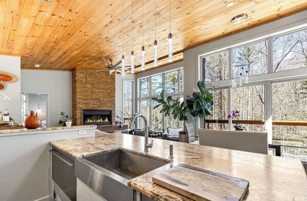 Outside, the property includes a pond, small waterfalls, and a private trail system that winds through the woods. After riding the DuPont or Pisgah bike trails, the outdoor shower offers a refreshing way to reset.