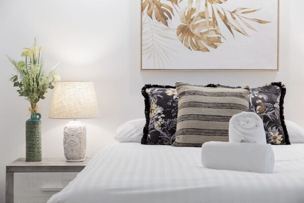 - The bedroom boasts a queen bed, bedside table to both sides of the beds, both with lamps, wardrobe for your belongings, wall-mounted TV and split system.