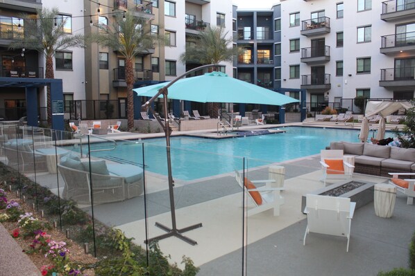 Luxury 1 Bed Apt. Pizza 5p-12am. Pool + Spa.