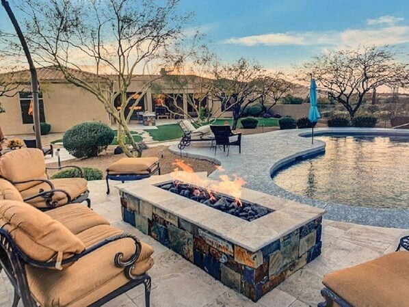 Saguaros, Sunshine, Stars, & Solitude, all while being close to great golf, dining, and shopping! This North Scottsdale home has it all! Welcome to this tranquil high desert home appropriately called "The Saguaro Sanctuary." Unwind in this 6 bedroom and 4.5 bath home on a 1.3 acre view lot in North Scottsdale. Fully equipped and beautifully furnished from top to bottom. Escape to the large heated pool* or soak in the brand new luxurious hot tub. After a day of sun and fun prepare your family dinner in the fully equipped gourmet kitchen or grill out while enjoying a cocktail at the outdoor bar/grill area. After dinner, sit by the firepit and enjoy amazing mountain views and towering cacti as you watch the sun set over Cave Creek's Black Mountain. This house sleeps large families comfortably with 4 King Beds, 1 Queen Bed, and a Bunk Room that sleeps 4. Enjoy a night shooting pool in the Billiards Room or just sit back and enjoy your favorite Sporting Event or Netflix show on 1 of the 6 Smart TVs in the house. There are two 75” HD 4000 TVs creating two separate viewing areas with one in the Great Room and another in the large Bonus Room, both overlooking the spacious covered patio. There is also a 65” HD 4000 TV in the Bunk Room for the kids. Another 65" TV is outside under the covered patio area. You can practice your hoops game either from the pool or in the driveway or play corn hole, throw the football, and/ or kick the soccer ball on the beautifully manicured back lawn. This house is perfect for two or three families as it offers three separate living areas. The attached Casita has it's own entrance thru the front courtyard. There is a king sized bed and full bathroom in the Casita. On one side of the house, you'll find the spacious Master Suite with separate office/workout room. On the other side of the home are four additional bedrooms and a large bonus room. If you enjoy exercising while on vacation, there is a brand new Peloton and fly wheel bike, weights, and yoga mats in the office off of the master. Enjoy yoga on the lawn, or take a hike on the neighborhood hiking trail. If golf is more your style, you are in the right spot! The legendary Boulders Golf Club is only a few miles away. The Legend Trails Golf Club is also just around the corner. We're not far from Troon, Desert Mountain, and many other courses. The property is so beautiful, you may not want to go out. However, if you do decide to explore, there are many things to see and do! Cave Creek and Carefree are both such cool towns and they have lots of restaurants, bars, and shops to check out. If you want more of a "city scene," you can drive 15 minutes south to DC Ranch or head to Kierland Commons/Scottsdale Quarter for great shopping and world class restaurants. At this unique property you get the best of both worlds. From The Saguaro Sanctuary, you can watch both the sunrise and sunset and gaze at the stars away from the lights of the city. This is a wonderful spot for families to escape and reconnect, or for friends to gather. We have a great location for guests to attend the Waste Management Phoenix Open Golf Tournament, the Fiesta Bowl, Super Bowl (2023), or the Barrett Jackson Collectable Car Auction. Look no further, this house truly has it all. No matter what the occasion, The Saguaro Sanctuary will exceed your expectations.