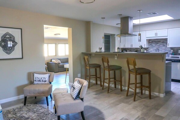 Filled with warm light and comfort, welcome to your home away from home, Sunswept Skies! This beautiful 1,900 sqft home sleeps 6-7 people with 2 en-suites. There is a third bedroom and a separate guest bathroom with a tub/shower combo which is perfect for the littles. Throughout the home, there are four 85' TVs, one in each bedroom, with Netflix provided. The den has a sleeper sofa for extra guests. For your entertainment, there is a TV to enjoy watching shows together. In the evenings sit and enjoy playing together with different board games to choose from. If you need to check a few emails or work a little while on your vacation, there is a desk area in the den to use.