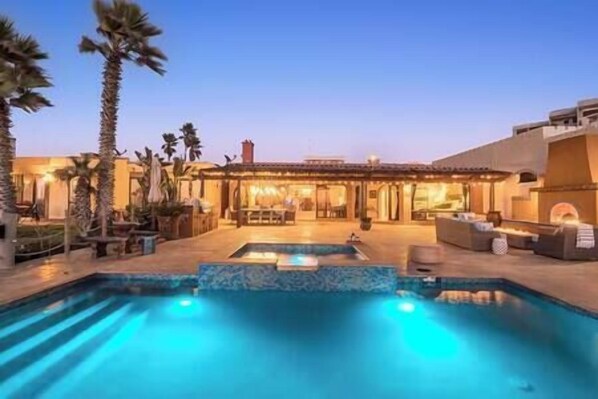 Entire private residence estate, located in exclusive community. Residence includes private garden courtyard with lawn, large ocean-front travertine patio with pool/spa/BBQ/Fireplace, 2 lower patios with large table and palapa umbrella, lower level has workout equipment under the stairs. Watch dolphins and migrating whales from the master bedroom, living room and patio or enjoy morning coffee in the courtyard with tropical landscape. Take a stroll down the beach during low-tide from your own private stairs to the beach. This is a luxurious and private resort-like home.