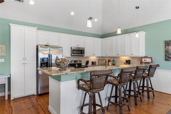 This 1400+ square foot property offers the amenities of home - dishwasher, microwave, washer/dryer, ceiling fans, DVD player, flat-screen TVs, and high speed internet. The well-stocked kitchen has a large island with seating, and there is an additional dining table with seating for six.