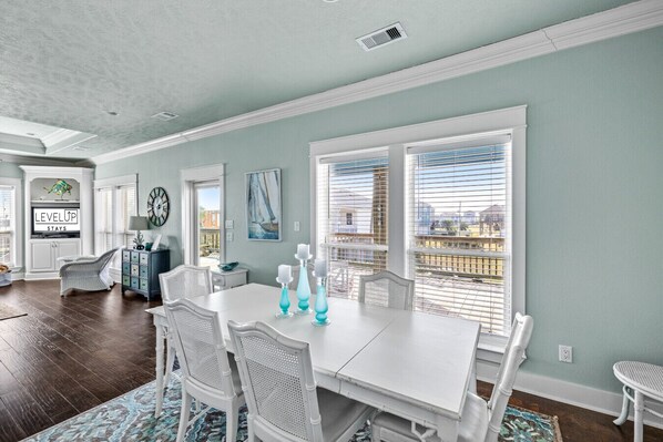 The moment you arrive, you’ll feel that relaxed coastal comfort. Inside, Villa Verdie is airy and filled with natural light, with a spacious living area for movie nights and downtime. The kitchen is fully stocked and ready for everything from quick breakfasts to a gulf-inspired seafood dinner, with an island and extra seating that makes mealtimes easy.