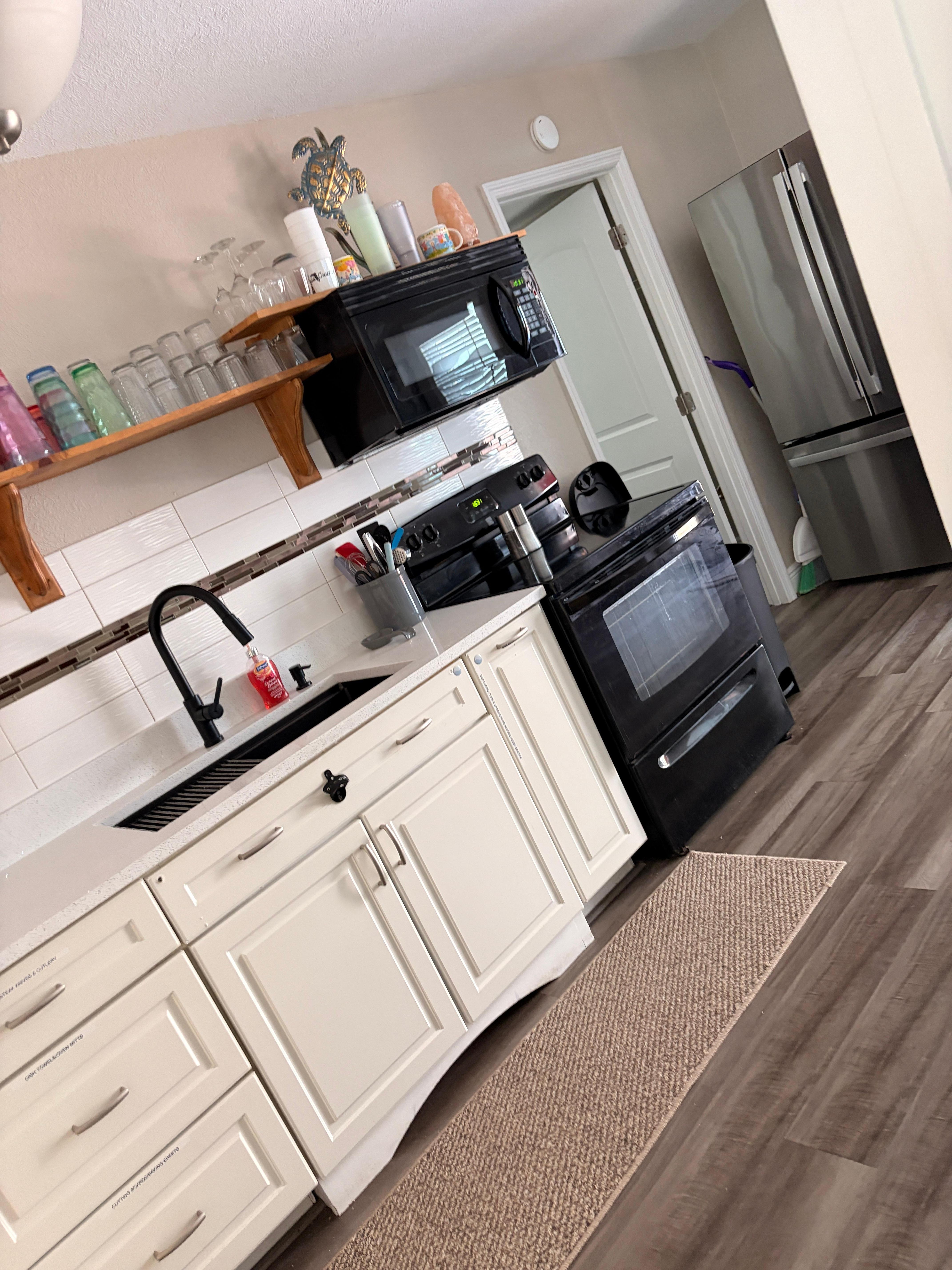 The kitchen and inside dining area are next to the living room. The kitchen has all new basic appliances to include Keurig pod/pot coffee maker, tea kettle, blender, skillet, crockpot, large boiling pot, and toaster oven. Other basic amenities include paper towels, an assortment of pod coffees, and basic spices. The dining table sits 4-7.