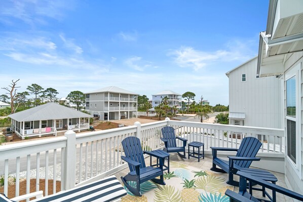 Upstairs there are 2 queen bedrooms, a full bath with a tub/shower combo, a full bath with shower and a bunk room that sleeps 4. There is also an outdoor seating area with views of the Gulf. Please note, this unit is pet-friendly upon owner approval.