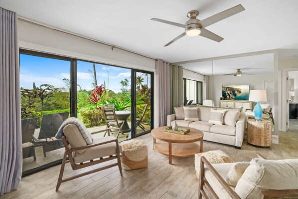Relax on the covered patio with unobstructed sunset, mountain, and waterfall vistas. Awaken to the soothing melodies of exotic birds, savor poolside grilling, and unwind in the resort's heated pool and Jacuzzi. Discover multiple beaches, restaurants, and shops in close proximity.