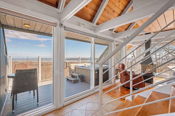 Enjoy stunning views over the magnificent St. Lawrence River from the private hot tub on the deck. Perfect for outdoor enthusiasts, families, a romantic getaway or friends seeking relaxation, this unique treehouse retreat blends modern comforts with the warm ambiance of a nature escape.