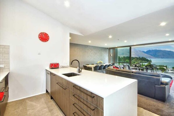 Denne moderne fem værelses, fire badeværelseslejlighed er alt hvad du behøver for en dejlig ferie i New Zealands nummer én feriemål.